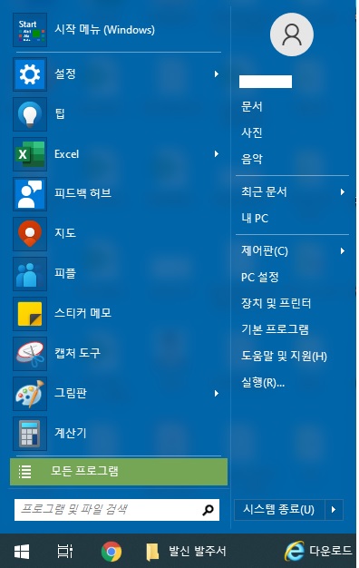딱 봐도 기존 윈도우 7과 같이 왼쪽에 모든 프로그램으로 넘어가는 탭이나, 왼쪽에 PC부터 제어판등 기존에 사용하던 방식으로 나열되어 있는 것을 확인 할 수 있습니다.