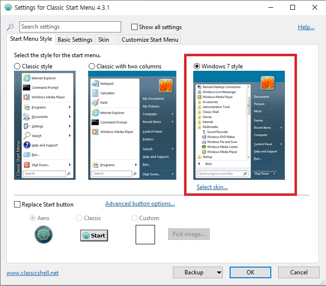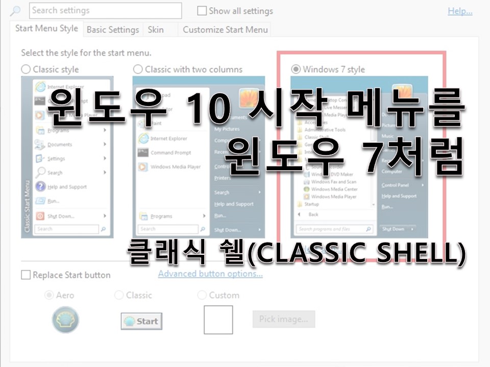 오늘의 블로그처럼 시작 메뉴만 변경하려면 2번째의 Classic Start Menu 외의 다른 탭을 아래 사진과 같이 변경해주면 됩니다.