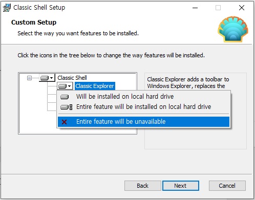 6-2. 나는 시작 메뉴말고는 필요없다 하시면 위의 사진과 같이 화살표를 클릭하여 [Entire Feature will be unavailable] 을 선택하시면 됩니다.