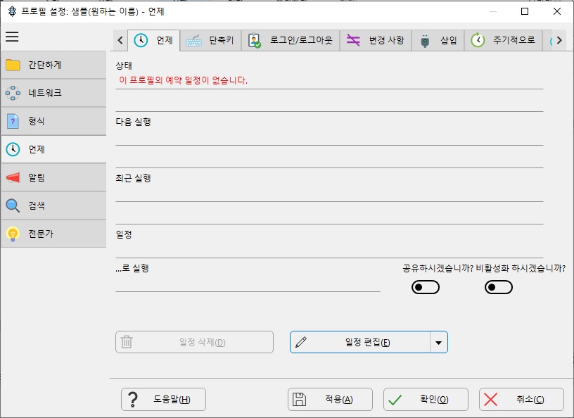 2)위와 같이 설정창이 뜨는데 [언제] 탭을 누르고 오른쪽 하단에 있는 [일정 편집]을 누릅니다.